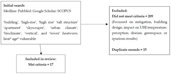 A literature search was conducted using electronic databases including: PubMed (January 1976–August 2022), (MEDLINE (1950–August 2022), SCOPUS, and Google Scholar. Terms included in the initial search were: ‘building’, ‘high-rise’, ‘high rise’ ‘tall structure’ ‘apartment’ ‘skyscraper’, ‘urban climate’, ‘bioclimate’, ‘vertical’, and ‘tower’. Results were then combined with the terms ‘health’, ‘heatwave’ ‘heat* and subsequently with age* and vulnerability. (*At the end of the search term ensures all words commencing with this word are included in the search).Specific health conditions (such as cardiovascular disease and respiratory diseases) known to be exacerbated by heatwaves were not included in the search strategy, as the focus of this review was to examine the intersection of high-rise living, heatwaves, and vulnerability. Secondary searches were conducted of bibliographies of identified articles and previous systematic reviews. Grey literature was also searched to include relevant articles, commentary, and reviews.