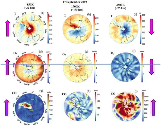 The polar projection of the stratospheric (~32, and 50 km) and mesospheric (~75 km) temperature (a–c), ozone (O3) (d–f), and carbon monoxide (CO) (g–i) during the peak warming day using MLS observations. The maps are shown at different isentropic surfaces (potential temperatures). The upward magenta color arrows show the increasing value, and the downward arrow is indicative of decreasing.