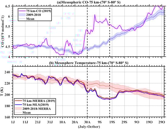 To quantify the mesospheric cooling due to CO, the daily variability of CO from MERRA and mesospheric temperatures using MERRA, and MLS over the SH polar region (70°–80° S) is depicted in Figure 3. Figure 3a shows the daily variability of CO at 75 km along with the climatological mean and standard deviation, and the variability of the polar mesospheric temperature in response to changes in CO during the SSW period is displayed in Figure 3b. From the figure, it is apparent that there was a strong anti-correlation between the mesospheric temperature and CO concentration during the SSW period. CO increased from 25 August and was at its highest level between the onset (30 August) and peak (17 September) SSW, and largely departed from its climatological mean. Additionally, CO is a byproduct of CO2, produced from the photolysis of CO2 at wavelengths <121 nm. Thus, a high CO mixing ratio implies the existence of abundant CO2 in the mesosphere. Nevertheless, photolysis causes a very minor decrease in the budget of CO2 in the mesosphere [30]. Therefore, the higher incidence of mesospheric cooling is due to increased CO2 and its infrared emission, as well as partly due to O3 depletion.