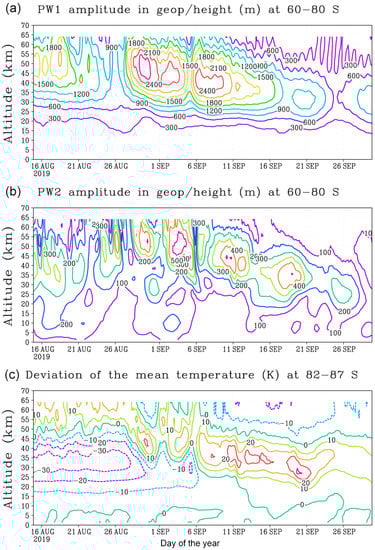 It is further suggested that [18] PWs with zonal wavenumbers 1–3, can propagate vertically and meridionally and play a dominant role in the transport of chemical species via the modulation of upward airflow and meridional circulation. However, in the present SSW, PWs with zonal wave numbers 1 and 2 (PW1 and PW2) are the strongest waves [9,10]. So, to ascertain the PW features from the surface to mesosphere in the SH polar region, the time series of the amplitudes of PW1 and PW2 averaged over latitudes of 60°–80 °S using MERRA are shown in Figure 6a,b, respectively. The time-altitude profiles of the deviation of the mean temperature at 82°–87° S are depicted in Figure 6c. It can be seen that during the entire SSW (26 August–19 September) there is an increase in the amplitudes of these waves, and during the peak of the SSW (6–19 September) the wave maximum descends, which is accompanied by a weakening of the E-P flux in the mesosphere and the cooling of this region (Figure 6c). This is a purely dynamic effect that causes changes in the temperature of the subpolar region during the SSW.