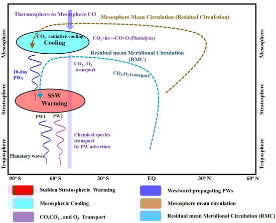 The overall mechanism of mesospheric cooling during the 2019 SH SSW is presented in a simple schematic sketch in Figure 7. The anomalous amplification of PW1 in the SH polar region led to the establishment of a minor SSW and strong warming in the stratosphere. As discussed above, the 10-day PWs generated in the lower atmosphere during the SSW and that propagate upward to the mesosphere could induce a change in the meridional circulation which in turn changes the mesosphere temperature. The chemical tracers generated in the tropical region are transported to the polar stratosphere and mesosphere through the residual mean meridional circulation. Below 70 km, the residual circulation is upward over the tropical region and downward over the winter polar (SH) region (Figure 5a,b); and above 70 km in the mesosphere, summer to winter residual circulation occurs during the SH winter [18,21,42]. The downward residual circulation in the stratosphere (mesosphere) induces warming (cooling) [18,20]. The upward-propagating PWs over the polar region could also transport the chemical species from the lower atmosphere [39]. Thus, an abundant amount of CO2 accumulated in the mesosphere during the 2019 SH winter, resulting in infrared radiative cooling. Furthermore, CO2 produces CO through photolysis; however, only a minor amount of CO2 is involved in the reaction. CO is also injected into the mesosphere from the thermosphere. This suggests that, in the present SSW, the mesospheric cooling occurred because of the combined effects of upward-propagating PWs and chemical species transport through wave-induced residual mean circulation. Therefore, the present study signifies the effect of anthropogenically emitted greenhouse gases on the upper atmosphere dynamics by inducing more mesospheric cooling during SSWs.