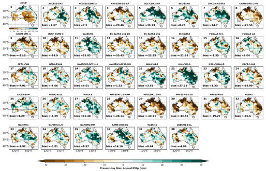 Climatological mean annual bias in total annual precipitation from very heavy rain days (R99p: mm) relative to the Australian Gridded Climate Data dataset (AGCD; panel 1) for the individual CMIP6 GCMs (panels 2–38). Data spans 1951—2014. Stippling indicates statistically significant differences using a student’s t-test at the 95% confidence level. The white masks in part of the inland domain are the regions with no station data.