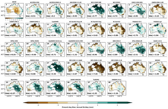 CMIP6 data supporting this study’s findings are freely available from ESGF (https://esgf-node.llnl.gov/search/cmip6/, accessed on 1 November 2020). Details about AGCD are available at the Australian Bureau of Meteorology website (http://www.bom.gov.au/metadata/catalogue/19115/ANZCW0503900567, accessed on 1 November 2020). The dataset is available on the NCI (National Computational Infrastructure) server in project zv2. Detail on how to access the data can be found at http://climate-cms.wikis.unsw.edu.au/AGCD (accessed on 1 November 2020).