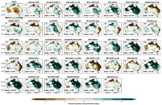 Climatological mean annual bias in the number of very heavy rain days (rain > 10 mm) (R10mm: days) relative to the Australian Gridded Climate Data dataset (AGCD; panel 1) for the individual CMIP6 GCMs (panels 2–38). Data spans 1951–2014. Stippling indicates statistically significant differences using a student’s t-test at the 95% confidence level. The white masks in part of the inland domain are the regions with no station data.
