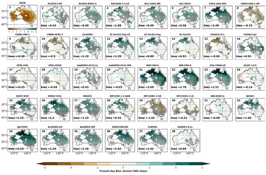Climatological mean annual bias in consecutive wet days (CWD: days) relative to the Australian Gridded Climate Data dataset (AGCD; panel 1) for the individual CMIP6 GCMs (panels 2–38). Data spans 1951–2014. Stippling indicates statistically significant differences using a student’s t-test at the 95% confidence level. The white masks in part of the inland domain are the regions with no station data.