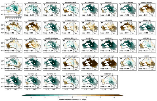 Climatological mean annual bias in consecutive dry days (CDD: days) relative to the Australian Gridded Climate Data dataset (AGCD; panel 1) for the individual CMIP6 GCMs (panels 2–38). Data spans 1951–2014. Stippling indicates statistically significant differences using a student’s t-test at the 95% confidence level. The white masks in part of the inland domain are the regions with no station data.