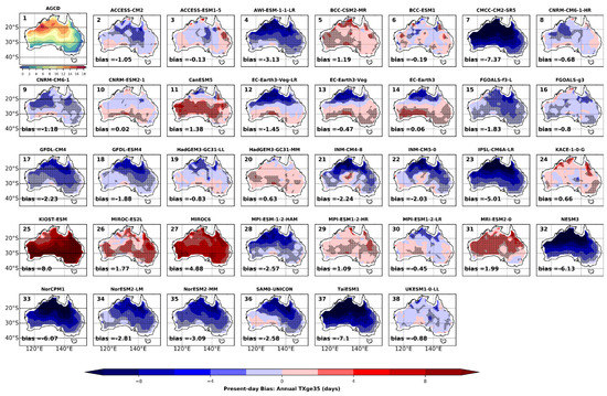 Climatological mean annual bias in the number of days when maximum temperature is greater than 35 C (Txge35: days) relative to the Australian Gridded Climate Data dataset (AGCD; panel 1) for the individual CMIP6 GCMs (panels 2–38). Data spans 1951–2014. Stippling indicates statistically significant differences using a student’s t-test at the 95% confidence level.
