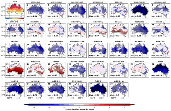 In Figure 6, GCMs KIOST-ESM, MIR°C6, CanESM5 and MRI-ESM2-0 show the strongest warm biases (~ 2–8 °C), whereas NorCPM1, NorESM2-LM and NorESM2-MM (Norwegian Climate Centre), TaiESM1, IPSL-CM6A-LR and CMCC-CM2-SR5 show the strongest cold bias (~ −2 to −10 °C) throughout the continent. Previously, Alexander & Arblaster (2017) [11] evaluated CMIP5 GCMs and noted that GCMs from the MIR°C family show a strong warm bias over Australia. Our results are broadly consistent with these findings. Most GCMs typically show cold bias ranging from −1 to −3 °C. Txge35 (Figure 7) and SU (Figure 8) follow a similar pattern to TXx, and the GCMs with warm bias in TXx also overestimate TXge35 and SU, whereas GCMs with cold bias in TXx, underestimate TXge35 and SU.