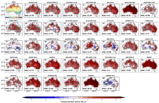 Climatological mean annual bias in maximum maximum temperature (TXx: °C) relative to the Australian Gridded Climate Data dataset (AGCD; panel 1) for the individual CMIP6 GCMs (panels 2–38). Data spans 1951–2014. Stippling indicates statistically significant differences using a student’s t-test at the 95% confidence level.