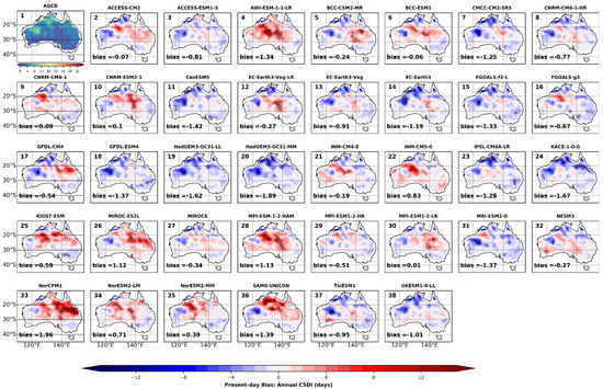 We use observational data from the Australian Gridded Climate Dataset (AGCD Evans et al. 2020 [52]) to compare the CMIP6 GCM simulated extremes with observations for the present-day period. AGCD data have a spatial resolution of 0.05° × 0.05° and are obtained from an interpolation of station observations across the Australian continent. Most of these stations are in the more heavily populated coastal areas with a sparser representation inland over central Australia. Taking the same approach as for the GCMs, we re-grid the AGCD data to a common resolution of 1.5° × 1.5° and then calculate the ET-SCI indices using ClimPACT.