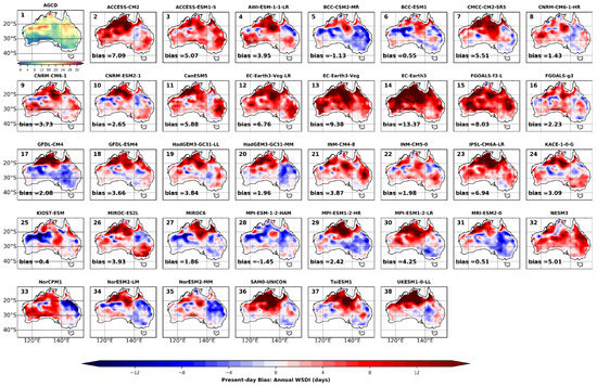 Climatological mean annual bias in the annual count of days with at least 4 consecutive days when daily maximum temperature > 90th percentile (WSDI: days) relative to Australian Gridded Climate Data dataset (AGCD; panel 1), for the individual CMIP6 GCMs (panels 2–38). Data spans 1951–2014. Stippling indicates statistically significant differences using a student’s t-test at the 95% confidence level.