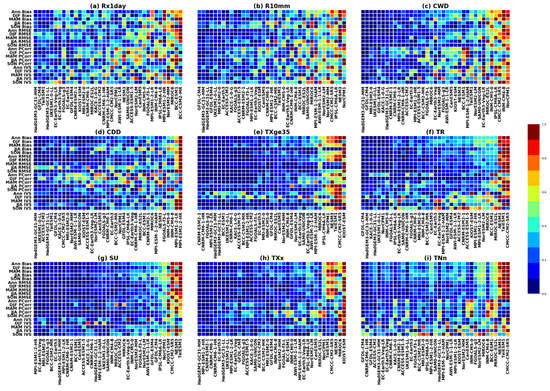 Overall, for both precipitation and temperature extremes (Figure 13 and Figure 14), we find that the top performing GCMs consistently score well (<0.2) in most metrics, capturing the magnitude, spatial and temporal patterns of the observed field. In contrast, the poorly performing GCMs are less skilled at capturing spatial and temporal patterns. For temperature extremes (except for CSDI and WSDI), approximately 5–7 GCMs perform poorly (normalised mean score of all metrics > 0.6) (Figure 13e–i). For precipitation extremes, 15–17 GCMs perform poorly (normalised score > 0.6) at capturing the spatial and temporal pattern of the observed field (Figure 13a–d). These results suggest that GCMs show higher overall skill in capturing observed temperature extremes. In contrast, many GCMs struggle to replicate observed precipitation extremes, with only a small subset of high-skill GCMs. These results reflect the findings of previous studies [11,21,22], which have suggested that GCMs struggle to capture precipitation and its extremes.