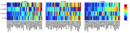 For analysing the performance of the models with respect to temporal variation, studies have proposed the evaluation of interannual variability score (IVS, Equation (2); Chen et al. 2011 [59]; Fan et al. 2020 [60]). Here STDm and STDo denote the interannual standard deviation of the model simulations and the observational data sets, respectively. This score analyses the performance of models with respect to temporal variation and suggests how well the models can reproduce the temporal standard deviation. Smaller IVS values indicate better performance of the model simulation.