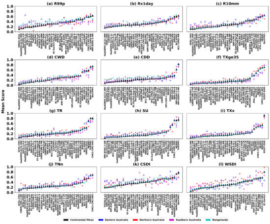 Spatially averaged normalised scores of the GCMs for the extreme indices (a) total annual precipitation from very heavy rain days (R99p), (b) maximum 1-day precipitation (Rx1Day), (c) number of very heavy rain days (rain > 10 mm) (R10mm), (d) consecutive wet days (CWD), (e) consecutive dry days (CDD), (f) number of days when maximum temperature is greater than 35 °C (Txge35), (g) tropical nights (number of days when minimum temperature > 20 °C) (TR), (h) summer days (number of days when maximum temperature > 25 °C) (SU), (i) maximum maximum-temperature (TXx), (j) minimum minimum-temperature (TNn), (k) annual count of nights with at least 4 consecutive nights when daily minimum temperature < 10th percentile (CSDI) and (l) annual count of days with at least 4 consecutive days when daily maximum temperature > 90th percentile (WSDI). Here, the smaller score values correspond to the better performance of GCMs. Also, for each extreme index, GCMs are arranged from best to worst performance as we move from left and right. Here black, blue, red, magenta and cyan colours denote means over the continent, eastern Australia, northern Australia, southern Australia and rangelands. The markers denote the continental (triangle), northern Australia (star), eastern Australia (circle), southern Australia (diamond) and rangelands (square) values. Data spans 1951–2014.