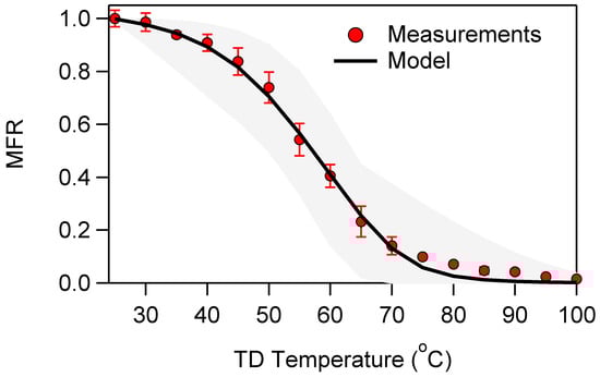 Mass fraction remaining (MFR) after the TD based on AMS measurements. All values have been corrected for size temperature dependent particle losses. The error bars correspond to one standard deviation. The modeled MRF has been calculated using the centerline residence time. The shadow area represents the minimum and the maximum MFRs of the solutions within 2% of the best solution.