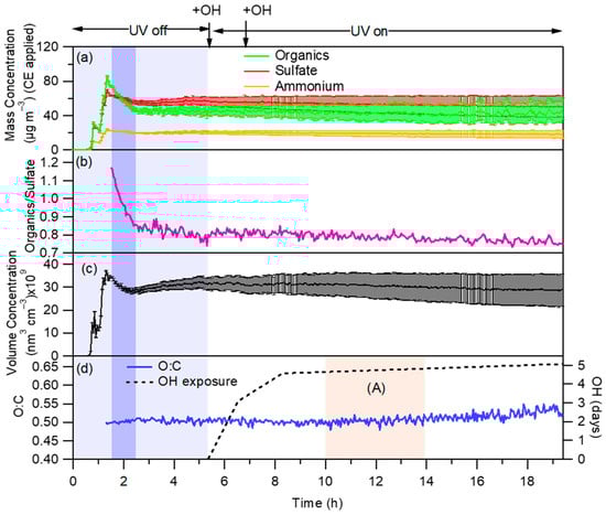 (a) Particle size-dependent wall-loss corrected time series of organics, sulfate and ammonium for experiment 2 (sulfate and norpinic acid were nebulized from the same aqueous solution). (b) Organics to sulfate ratio. (c) Particle size-dependent wall-loss corrected time series of volume concentration obtained from the SMPS. (d) Time series of O:C; Period (A) corresponds to an ambient exposure of around 5 days. The bars in (a,c) correspond to the uncertainty from the experimental calculation of the wall-loss rates (k) in Figure S4. Two shots of HONO were injected for this experiment.