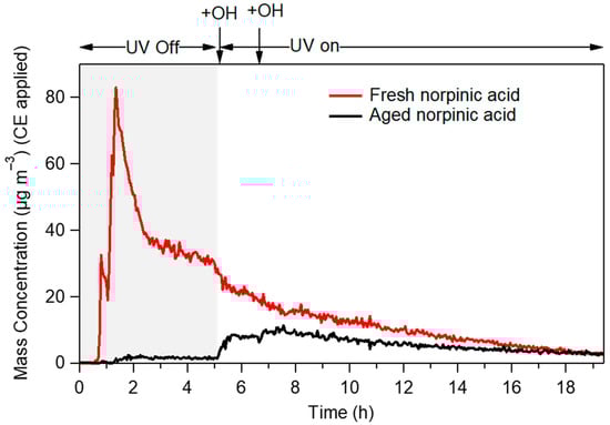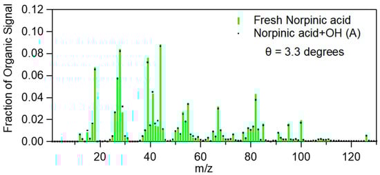 Comparison of the mass spectra of fresh norpinic acid aerosol (taken while the UV lights were off) and the mass spectrum from the period (A) as indicated in Figure 3.