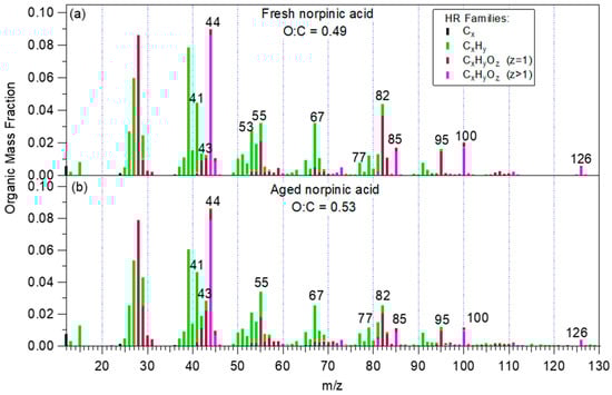 The mass spectrum of the: (a) fresh and (b) aged norpinic acid aerosol derived from the PMF analysis of the AMS measurements in experiment 2.