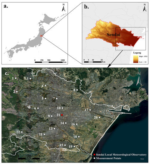 Map showing the location of Sendai and the distribution of temperature and humidity recorders and Sendai Local Meteorological Observatory in the study area. (a) Map of Japan; (b) topography of Sendai area; (c) distribution of temperature and humidity recorders on satellite maps.