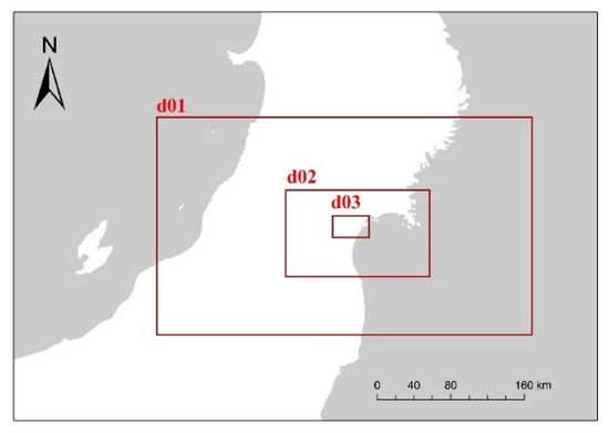 In this study, we used the Advanced Research Weather Research and Forecasting (ARW-WRF) model developed by the National Center for Atmospheric Research (NCAR) and the National Center for Environmental Prediction (NCEP) to numerically simulate the Sendai urban area [42,43]. The main physical settings of the model are shown in Table 2. These settings are similar to those used in a [39] study of the extent of sea breeze cooling in the Sendai area. In this simulation, we used three nested domains (Figure 3). The outer square is domain 1, which consists of 37 × 28 grids with a spatial resolution of 9 km. Domain 2 consists of 43 × 34 grids with a spatial resolution of 3 km. The main analysis domain is domain 3, which consists of 31 × 28 grids with a spatial resolution of 1 km. A horizontal resolution of 1 km is widely used in numerical studies of urbanization and sea breeze [34,44,45]. The number of vertical layers used in this study was 30, and the urban canopy model [46] and WSM 6-class graupel scheme [47] were used. There are many planetary boundary layer (PBL) schemes available, and some researchers have made detailed comparisons of the different schemes [48]. For this simulation, we used the Mellor–Yamada–Janjic model [24]. The Rapid Radiative Transfer Model for General circulation models (RRTMG) longwave scheme and Dudhia shortwave scheme in the general circulation model were used. The land data utilized data from the Digital Land Information released by the Japanese government in space with a resolution of 1 km. The initial boundary conditions for the simulations were generated from the final operational global analysis data (FNL) from the National Center for Environmental Prediction (NCEP). The calculation period was from 1 to 10 August 2016. The simulated data in domain 3 finally generate 31 × 28 point data, and each point datum contains the values of temperature at 2 m above ground and specific humidity at 2 m above ground. The frequency of the numerical output is 10 min, which is the same as the measured data.