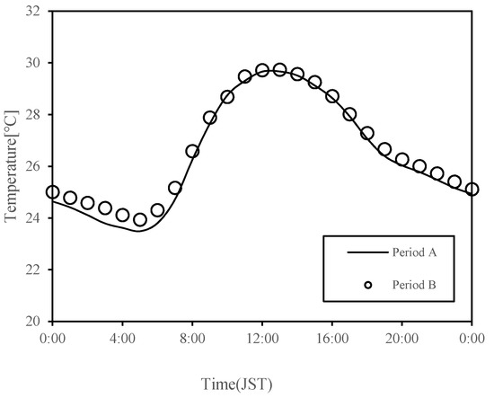 In this study, data from Sendai local meteorological observatory were used to analyze and organize the climate characteristics of Sendai city in summer. The study period was chosen to be three years, 2018–2020. We compared the three-year study period (August 2018 to 2020, Period B) with a twelve-year period (August 2010 to 2021, Period A) for both periods. The summer sea breeze days of the two periods were screened, and then, the daily average temperature curves of the sea breeze days of the two periods were overlapped (Figure 4). The overlap revealed that the two data points overlap well. Therefore, we believed that the study period is a good representation of the temperature characteristics of the sea breeze days in Sendai in summer.