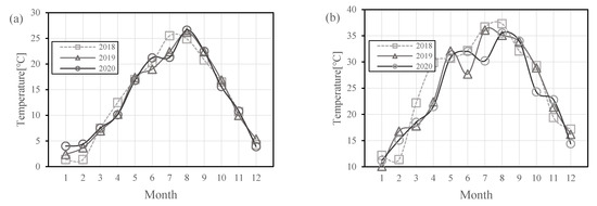 (a) Monthly average temperature from 2018 to 2020; (b) monthly maximum temperature from 2018 to 2020.
