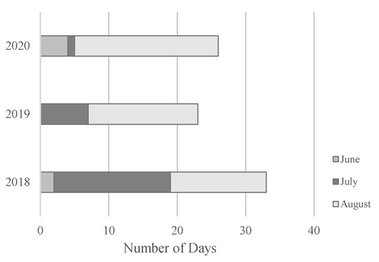 We collated the temperatures for all sea breeze days in August during the study period. The number of sea breeze days increased each year from 2018 to 2020. In 2020, more than 20 days were defined as sea breeze days. Additionally, in any given year, more than half of the days identified as sea breeze days had high temperatures greater than 30 °C (Figure 7). From this, we can find that the temperature is usually very high on sea breeze days.