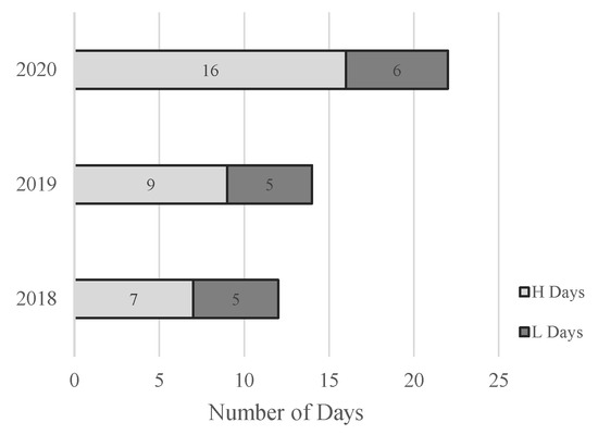 Number of days with maximum temperatures above 30 degrees Celsius (H Days) and below 30 degrees Celsius (L Days) for August 2018 to 2020 and defined as sea breeze days.