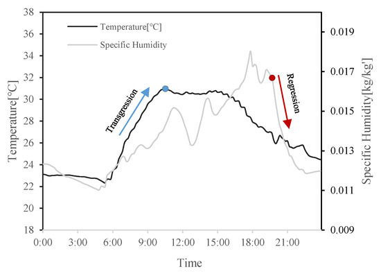 Unlike the previous definition of sea breeze arrival and retreat times by wind conditions, we determined the sea breeze arrival and retreat times based on the variation in sea breeze daily temperature and specific humidity (Figure 8). When the sun rises, the temperature of the land begins to rise, forming a pressure difference with the sea, and the air begins to move from the sea to the land. The wind blowing from the direction of the sea brings cold air to the land; thus, we define the point in time when the temperature starts to drop after sunrise as the time when the sea breeze arrives. The continuous rise in temperature is suppressed when the sea breeze arrives, at which point it lowers the temperature of the city. Additionally, it also brings humidity. The temperature fluctuates in a constant range, and the humidity rises again after a significant drop at midday due to strong sunlight. Because of the weakening of insolation, the temperature starts to exceed the constant range, and the rate of decrease increases significantly. At this point, the specific humidity also drops sharply once again, and we define this moment as the time of retreat of the sea breeze.