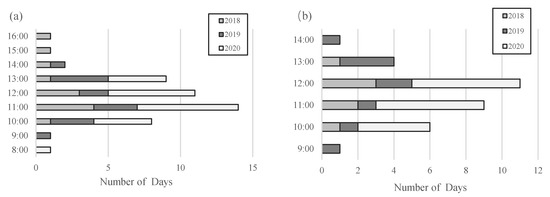 (a) Sea breeze arrival times for all sea breeze days in August from 2018 to 2020. (b) Sea breeze arrival times for August sea breeze days with maximum temperatures above 30 degrees Celsius from 2018 to 2020.