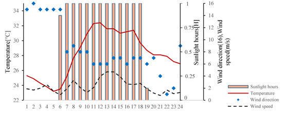 According to the above rule, we chose the days when the sea breeze arrived at 11:00 or 12:00. On the basis of meeting the conditions of sea breeze day identification, in order to reduce the disturbing factors, in the daylight requirements, we chose days with all-day sunshine, and we chose days when, after the sea breeze reaches the land, the wind direction was stable. We eventually chose 5 August 2016 as the case study date (Figure 10).