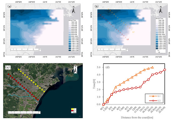 (a) Sea breeze arrival time map; (b) distribution of points in the L1 and L2 directions on the sea breeze arrival time map; (c) distribution of points in the L1 and L2 directions on the satellite map; (d) arrival times of points in the L1 and L2 directions.