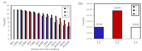 The sea breeze lasts for a minimum of 6 h and up to 15 h (Figure 13a). As can be seen from Figure 14, the duration increases gradually from inland to coastal times. The histogram in all three directions shows that the increase in duration is uniform and continuous (Figure 14a). Additionally, the total duration histogram showed that the cumulative duration of L1 and L3 was about the same. Additionally, in L2, the cumulative duration is about 13 h longer than in L1 and L3 (Figure 14b).