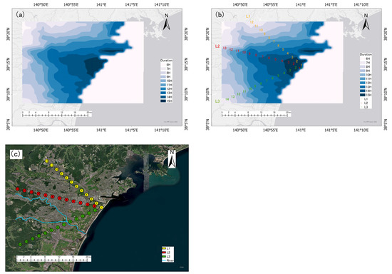 (a) Sea breeze duration time map; (b) distribution of points in the L1, L2 and L3 directions on the sea breeze duration time map; (c) distribution of points in the L1, L2 and L3 directions on the satellite map.