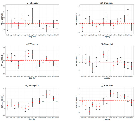 Figure 4 displays the RRs for COVID-19 cases in the southern cities. We concluded that each unit decrease in the DI increased the COVID-19 risk, mainly from 0 to 7 lag days in southern China, especially in Shanghai, Guangzhou, and Shenzhen. In Chengdu, the RRs were below 1.0 at 1, 3, 5, and 8–14 lag days. In Chongqing, the RRs were below 1.0 at 0, 4–5, 9, and 14 lag days. In Wenzhou, the RRs were below 1.0 at 3, 8, 9, and 12–14 lag days. In Wuhan, the RRs were below 1.0 at 0–1, 5–7, 9, and 12 lag days. In Shanghai, the RRs were below 1.0 at 0–1 and 5–6 lag days. In Guangzhou, the RRs were below 1.0 at 0–7 lag days. In Shenzhen, the RRs were below 1.0 at 0–6 and 14 lag days.