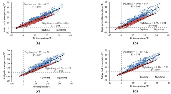 Distribution of road surface (bridge deck) temperature against air temperature at road surface station 1 (a), road surface station 2 (b), bridge deck station 1 (c) and bridge deck station 2 (d) (● represents daytime; ● represents nighttime; unit: °C).