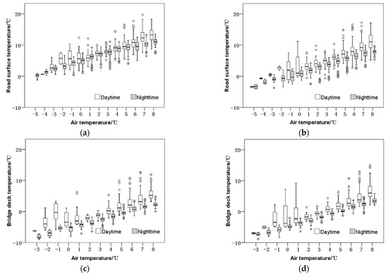 Box diagram of air temperature against surface temperature at road surface station 1 (a), road surface station 2 (b), bridge deck station 1 (c), bridge deck station 2 (d). (White box is for daytime; gray box is for nighttime. The abscissa value represents a range of ±0.5 °C.)