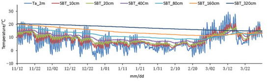 Variations of hourly air temperature and subsurface temperature at Hefei station from 11 December 2021 to 30 March 2022 (Ta_2m represents air temperature at 2 m; SBT_10 cm, SBT_20 cm, SBT_40 cm, SBT_80 cm, SBT_160 cm, SBT_320 cm represent subsurface temperature at 10 cm, 20 cm, 40 cm, 80 cm, 160 cm and 320 cm).