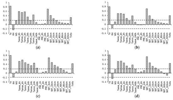 From the correlation coefficients between surface temperature and meteorological factors shown in Figure 5, surface temperature has the highest correlation with air temperature, and is closely related to mean air temperature, maximum and minimum air temperature in the past 6 h, and minimum temperature in the past 24 h. In addition, the correlation between surface temperature and subsurface temperature decreases with depth, and the highest correlation coefficient is with subsurface temperature at 5 cm depth. The correlation coefficient between surface temperature and the time coefficient also passed the significance level of 0.05, indicating that time factor also has a significant impact on surface temperature. In addition, surface temperature highly correlates with relative humidity, however, correlations between surface temperature and all kinds of precipitation factors are weak.