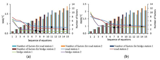 Taking each factor in Table 1 as the independent variable, the random forest algorithm was used to establish the retrieving model of surface temperature, and the stepwise regression method was used as a comparison. In the stepwise regression, the number of equations passed the significance test is 21, 17, 16 and 9 at road surface station 1, road surface station 2, bridge deck station 1 and bridge deck station 2, respectively. Figure 6 shows the ME and RMSE of the top 15 models with the minimum RMSE (9 for bridge deck 2). On the whole, the fitting error of the equation decreases with the increase in the number of factors. In the fitting of road surface temperature, the errors in the first six equations decrease obviously with the increase in the number of factors, and then slowly decrease. Different from the bridge deck temperature, in the first three equations for bridge deck temperature, the error decreases rapidly with the increase in the number of factors, and then the error shows little decrease with the increase in factors. The error of bridge deck temperature is less than that of road surface temperature when the number of factor is 2 or more. The regression equations of each station were established by combining MSE, RMSE and the complexity of the equation (Table 2).