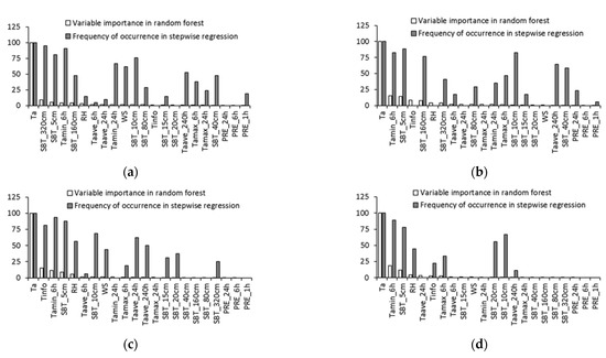 The importance of each factor in the random forest model (white bar) and the possibility of the occurrence of each factor in step wise regression model (gray bar) at (a) road surface station 1, (b) road surface station 2, (c) bridge deck station 1, (d) bridge deck station 2.