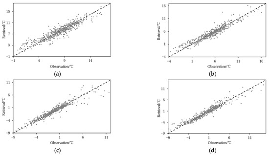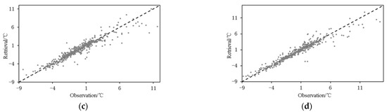 Scatter plot for observations and retrievals of road surface (bridge deck) temperature using stepwise regression model at road surface station 1 (a), road surface station 2 (b), bridge deck station 1 (c), and bridge deck station 2 (d).
