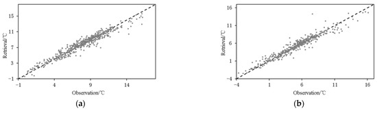 Based on the stepwise regression equation in Table 3 and the random forest model shown in Table 4, the training set was used to establish the model and the test set was used for the test. Figure 8 and Figure 9 show the scatter distribution of observations and retrievals of road surface (bridge deck) temperature using the stepwise regression model and random forest model, respectively. The road surface temperature retrieved by stepwise regression is consistent with the observations (Figure 8). The retrievals of temperature over bridge deck are better than those over road surface, especially near 0 °C. Therefore, the model can accurately retrieve the bridge deck temperature.