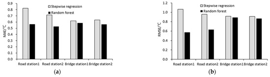 The training set was used to establish the model, and the test set was used to calculate MAE and RMSE (Figure 10). MAE of the two road surface stations retrieved by the random forest model are 0.57 °C and 0.53 °C, and RMSE are 0.57 °C and 0.63 °C, respectively. MAE of the two bridge deck stations are 0.59 °C and 0.56 °C, and RMSE are 0.89 °C and 0.87 °C, respectively. The random forest algorithm is superior to the stepwise regression algorithm in both road surface and bridge deck temperature retrieving. Especially in the retrieving of road surface temperature, MAE decreases by 0.19 °C and 0.26 °C, and RMSE decreases by 0.33 °C and 0.49 °C using the random forest model. The bias in the retrievals can be originated from the model itself as well as the error in the observations [28,29]. Meanwhile, the ability of the random forest method in retrieving bridge deck temperature is better than that of road surface, however, the ability of stepwise regression in retrieving road surface temperature is better than that of bridge deck.