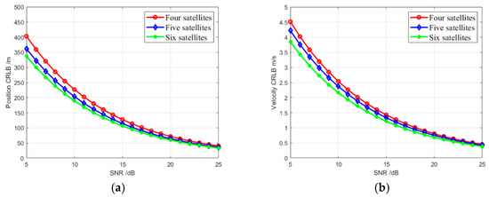 CRLB of joint localization and motion parameter extraction method. (a) Position CRLB versus the different number of satellites. (b) Velocity CRLB versus the different number of satellites.