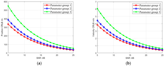 Next, the CRLB of the target localization and velocity estimation, under the condition that the SNR of each satellite is different, was analyzed. Three groups of parameters were simulated, and the parameter settings were , , and , respectively. Figure 3 illustrates the CRLB of target position and velocity versus SNR under different parameters. Figure 3a shows that, when the SNR of each satellite was different after signal processing, the target localization accuracy was lower than that of equal SNR. Moreover, comparing the CRLB positions of parameter groups 2 and 3, it is seen that a greater SNR variation between each satellite led to a poorer localization performance. The CRLB of the velocity estimation was consistent with the CRLB of the target position.