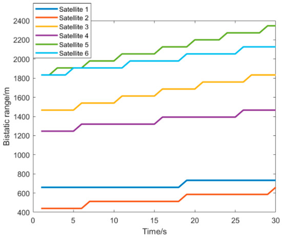 Figure 5 provides the extracted bistatic ranges versus the time for different satellites. For brevity, the bistatic ranges of six satellites are plotted in a map. It can be seen from the figure that the bistatic distance changed uniformly with the time. Meanwhile, it is seen that, for a certain satellite, different times may correspond to the same bistatic distance, which was mainly caused by the following two reasons: one is that the target is moving slowly, and the other is the poor range resolution. Usually, the range resolution depends on the signal sampling frequency. In the simulation, the signal sampling frequency was set as four times the signal bandwidth. Hence, the range resolution was 73.3 m. In order to improve the accuracy of bistatic distance extraction, we can increase the signal sampling frequency of the radar system.