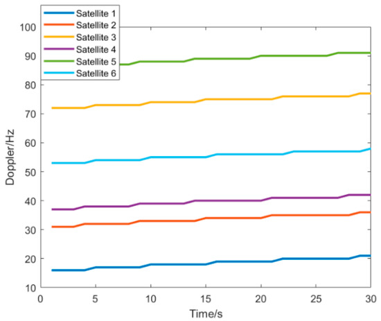 To validate the feasibility and effectiveness of the proposed method, the simulation results were performed with six satellites by using the MATLAB software. The satellite and radar parameters are shown in Table 1. GPS L1 signal was adopted as the transmitter of opportunity. The initial position of the target was , and the velocity was . The signal acquisition time was 30s.