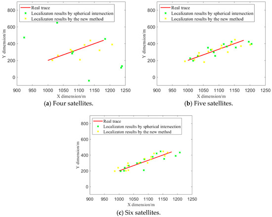 Figure 7 shows the target positioning results using four, five, and six satellites, respectively. Figure 7a shows the results of target positioning with four satellites. It can be seen from the figure that the localization point was far from the real position of the target, and the localization error was large, up to hundreds of meters at the maximum. When five satellites were used for target positioning, the accuracy of target positioning results was significantly improved, and the positioning points were evenly distributed on both sides of the real motion trajectory of the target. When the number of satellites reached six, the number of localization points distributed on both sides of the target trajectory was more and more dense, which proves that the localization accuracy of the system has been further improved. The localization results of the proposed method were consistent with the localization accuracy analysis of the CRLB. It can be concluded that more satellites can guarantee a higher localization performance, and the localization results by [7] also validate this point.