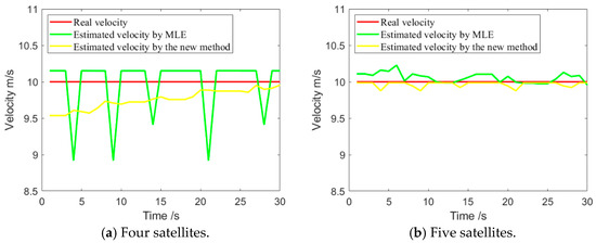 Figure 8 shows the target velocity estimation results under four, five, and six satellites. It can be seen that when the satellite number was four, due to the initial target position is set as the position estimated by [7], the estimation accuracy in [13] was low. The target estimation accuracy by the new method is gradually improved over the time. When six satellites were considered, the two methods achieved a proximate estimation result. It can be inferred that, with an increase of the number of satellites, the velocity estimation accuracy of the system will approach the real one.